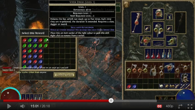 Certains objets haut niveau possède des ‘‘’linked sockets’’’. Toutes les skill gems mises dans des linked sockets seront liées et ne formeront qu’un seul nouveau skill. C’est le système de runestone de Diablo 3, en 10 fois plus flexible. (non il n’existe pas que 3 skill gems différentes lol)