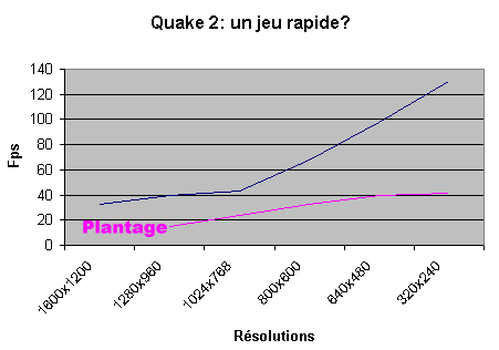 Jusque-lĂ , tout est parfait! Pour peu d’voir un accès a Net, Quake2 est un jeu fabuleux… Seulement, il n’est pas destinĂ© Ă toutes les machines. Le graphique ci-contre vous le montre (benchmarking fait en Open GL): la courbe bleue reprĂ©sente les performances de mon PC (un P350 avec une Riva TNT). La courbe rose reprĂ©sente les performances du PC de mon frère (un P200 MMX mal configurĂ© avec une Banshee). Le P350 atteint le score de 33 Frames per second dans la rĂ©solution la plus Ă©levĂ©e (1600x1200) et le P200… plante. Et si l’envie prend de passer en 320x240 (rĂ©solution la plus faible et fenĂŞtre minus), le P200 atteint avec peine 40 Fps alors que le P350 speede Ă 130 Fps…