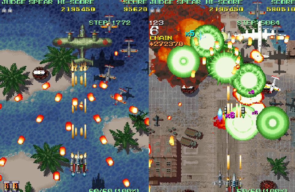 Une fois le niveau lancé, on se retrouve dans un shmup nerveux, voire trop intense si on a choisi un avion un peu trop lent du blaster. Petit détail génial : le nom et la provenance de la musique sont indiquées au début du niveau! Parfait pour agrandir sa culture des shmups tout en soignant son Chain bonus.