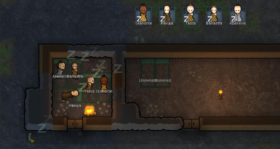 Mais en attendant ce grand projet, il faut passer la première nuit. Les survivants utilisent les reliefs naturels pour établir une minuscule salle commune à même la pierre. Tout le monde dort au sol, avec une torche pour seule source de chaleur.