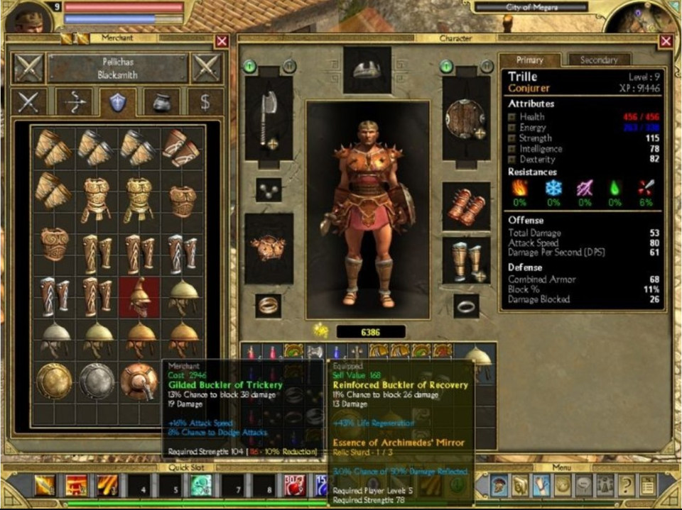 TL2 a grandement revu son système de stats, ce qui se ressent sur les objets: on n’a plus l’impression d’avoir des modificateurs inutiles. Les items droppent beaucoup, parfois comme une fontaine, mais c’est nécessaire vu la difficulté (Vétéran). Par contre, les raretés ne sont pas évidentes. Certains rares ont moins de modificateurs que des magiques. L’enchanteur a été viré de la ville, et se trouve maintenant aléatoirement dans les niveaux. Chaque objet ne peut recevoir que 2 enchantements et l’or est beaucoup plus difficile à trouver, ce qui réequilibre énormément le système.