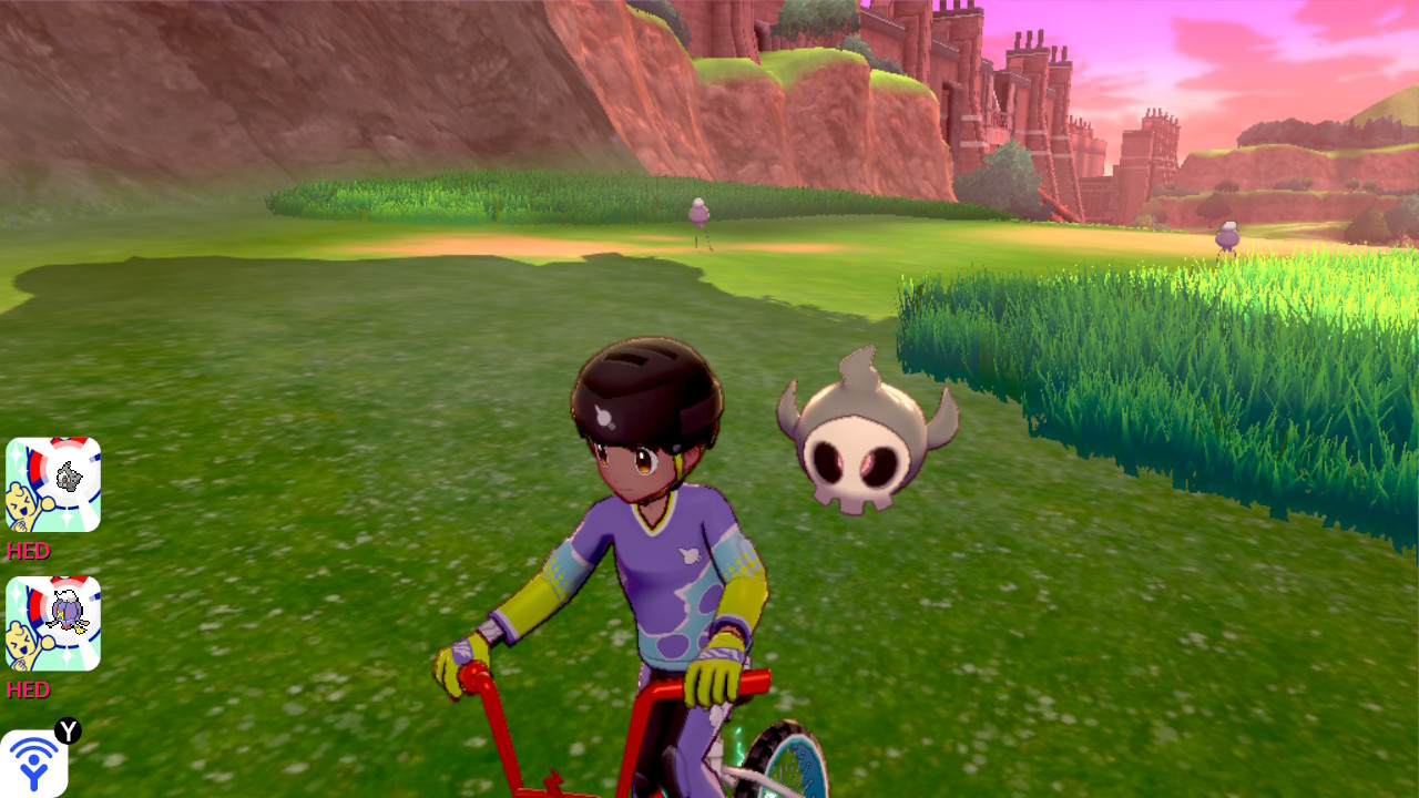 Et puis 10 secondes après: Boum! Une icône “:exclamation:” apparaît et Skelenox, un crâne volant, se met à me poursuivre sans relâche… je suis dans Doom Eternal ou dans Pokémon, là? J’enfourche le vélo, enclenche le boost, mais en tentant d’éviter un Alakazam qui flotte dans les airs, je rentre par inadvertance dans 2 pokémon rampants pas très visibles dans les hautes herbes. C’est la première fois qu’on peut faire tout ça dans un jeu Pokémon et c’est super.