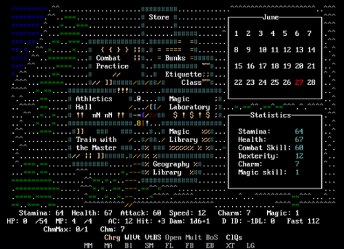 Dans un monde tout en ASCII, vous dirigez une princesse qui doit gérer son emploi du temps. La semaine, on va en cours (au choix : combat pour augmenter sa puissance, athlétisme pour augmenter sa vitesse et danse pour augmenter son charme). Le week-end, c’est quartier libre. On peut se reposer pour augmenter ses PV max, ou alors on peut aller voir les “maîtres” pour apprendre de nouveaux sorts ou de nouvelles prises de karaté. Et le summum des loisirs de princesse : s’enfuir de l’école pour aller baffer des monstres hors dans les différents donjons qui peuplent le pays.