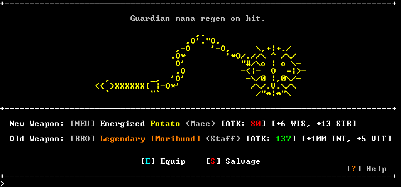 L’ASCII, oui, y’en a dans Sanctuary RPG. Mais l’ASCII n’est pas utilisé comme dans les roguelikes. Ici, pas d’écran rempli de symboles. On voit les visages des NPC, le look menaçant des armes que l’on drop, la silhouette imposante du dragon, et les contrées verdoyantes que l’on traverse. La musique, au départ incongrue, se fait palpitante et entraînante.