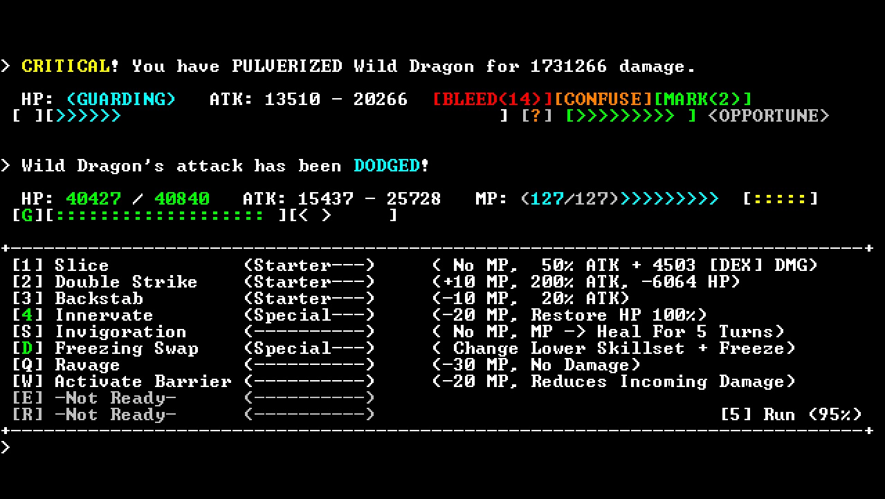 Le joueur a deux choix possible à chaque tour: explorer la carte ou passer un peu de temps en ville. Pour se déplacer, il suffit d’appuyer sur la touche indiquée et d’appuyer sur Enter. Pour les plus observateurs, on peut trouver des “secret rooms” en repérant des anomalies dans la représentation ASCII des décors. Pour y accéder, il faut taper la touche correspondant à l’anomalie.