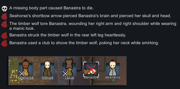 Seahorse et Hakuja bandent leur arc bien à l’abri derrière les sacs de sable. Tasca et Banastra s’approchent du prédateur, brandissant leurs couteaux et leurs masses. Banastra se bat très bien. Sans aucune peur ni réserve, elle attaque le loup au cou et aux pattes. Le loup la mord au bras droit. La combattante fait un bond en arrière. Et c’est à ce moment-là que la flèche de Seahorse vient toucher Bansastra à la tête.